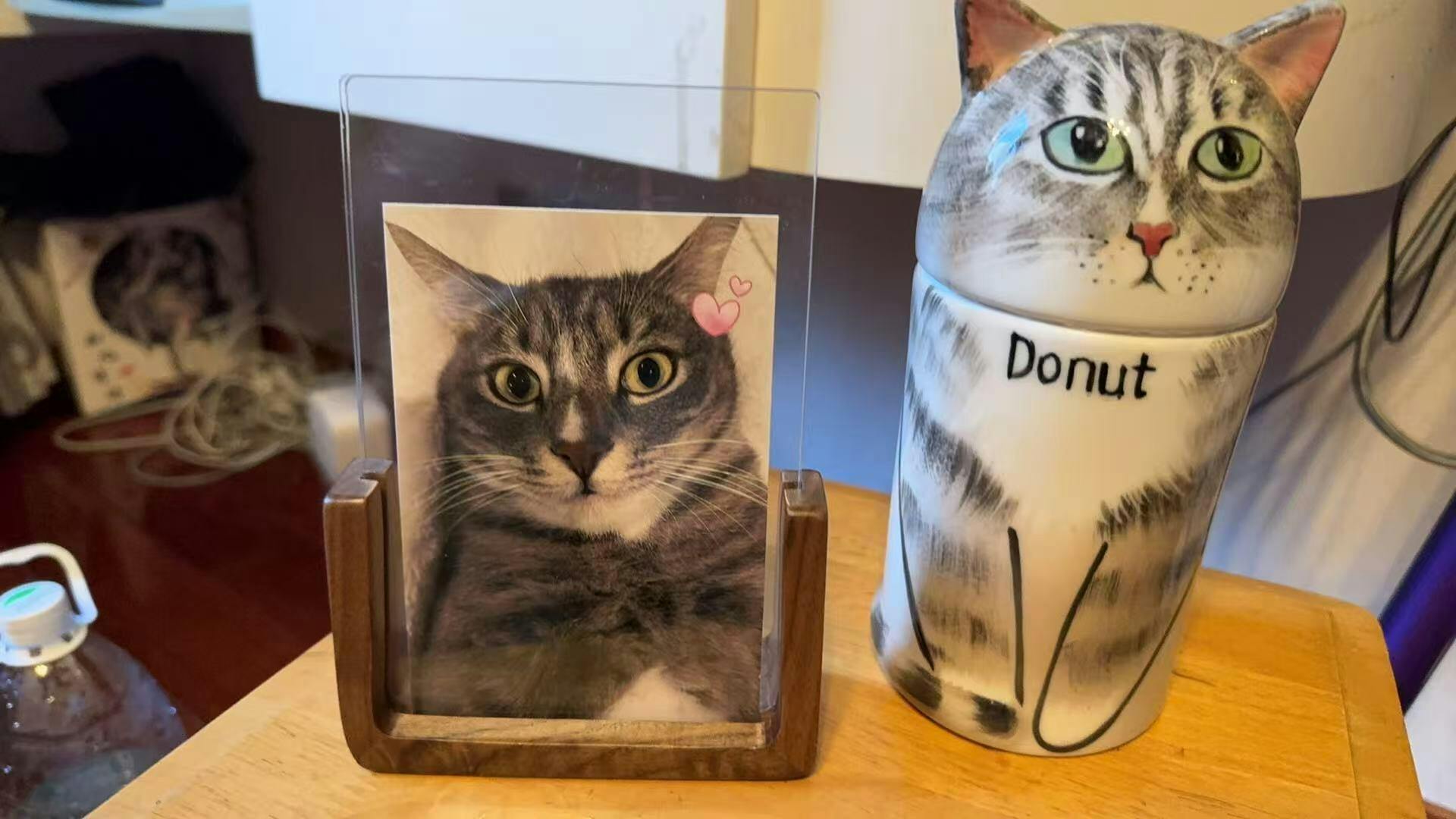 Custom handmade ceramic pet urn with cat photo and engraved name.